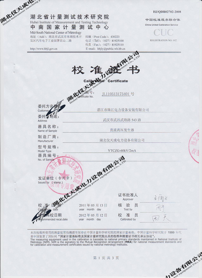 轉(zhuǎn)載:"YTCZG-60kV/2mA直流高壓發(fā)生器的資質(zhì)證書" 請注明來源于儀天成電力。 更多技術(shù)問題請致電儀天成電力客戶服務(wù):027-87876585,技術(shù)部專線:027-87876585,在線客服:719388481