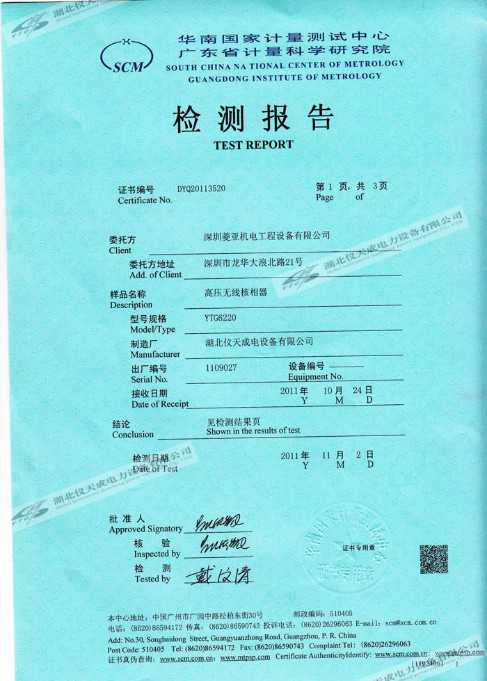 YTC6220高壓無(wú)線(xiàn)核相器的資質(zhì)證書(shū)